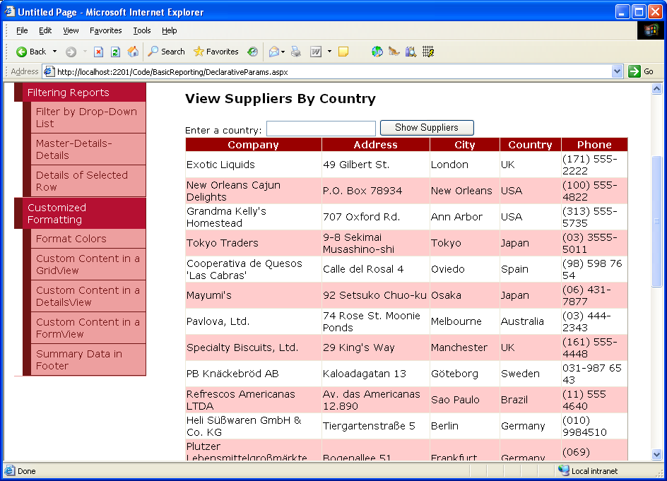 With this change the DeclarativeParams.aspx page shows all of the suppliers when first visited (or whenever the CountryName TextBox is empty).