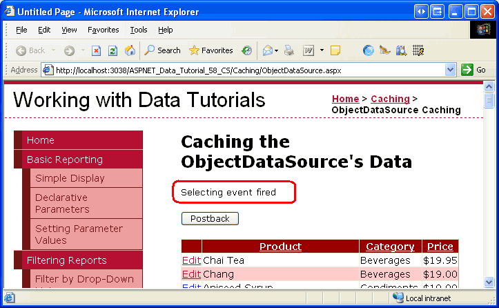 Visit this page in a browser. When the page is first visited, the text Selecting event fired is shown. Click the Postback button and note that the text disappears (assuming that the GridView s EnableViewState property is set to True, the default). This is because, on postback, the GridView is reconstructed from its view state and therefore doesn t turn to the ObjectDataSource for its data. Sorting, paging, or editing the data, however, causes the GridView to rebind to its data source, and therefore the Selecting event fired text reappears.