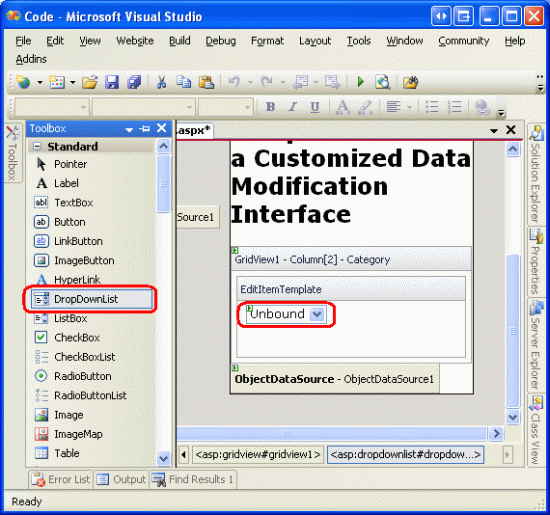 Since the BoundField was marked as read-only, both the ItemTemplate and EditItemTemplate contain a Label Web control whose Text property is bound to the applicable data field (CategoryName, in the syntax above). We need to modify the EditItemTemplate, replacing the Label Web control with a DropDownList control.