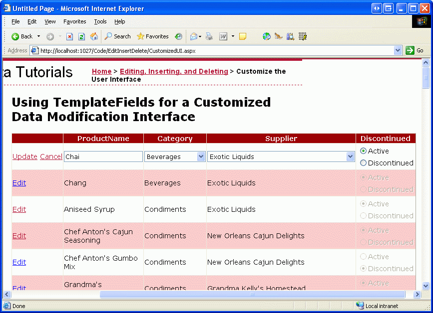 Currently the products' Discontinued data field is expressed using a CheckBoxField, which renders a disabled checkbox for the read-only rows and an enabled checkbox for the row being edited. While this user interface is often suitable, we can customize it if needed using a TemplateField. For this tutorial, let's change the CheckBoxField into a TemplateField that uses a RadioButtonList control with two options "Active" and "Discontinued" from which the user can specify the product's Discontinued value.