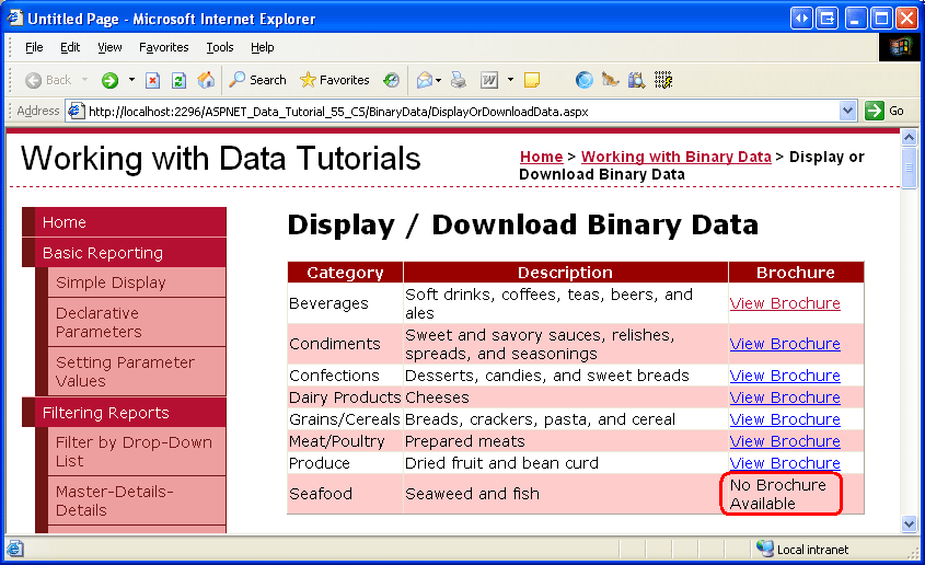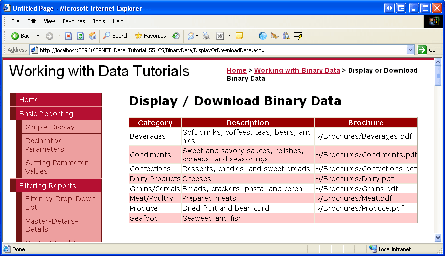 In this tutorial we examined how to present binary data. How the data is presented depends on the type of data. For the PDF brochure files, we offered the user a View Brochure link that, when clicked, took the user directly to the PDF file. For the category s picture, we first created a page to retrieve and return the binary data from the database and then used that page to display each category s picture in a GridView.