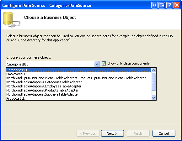 Figure 3: Configure the ObjectDataSource to Use the CategoriesBLL Class (Click to view full-size image)