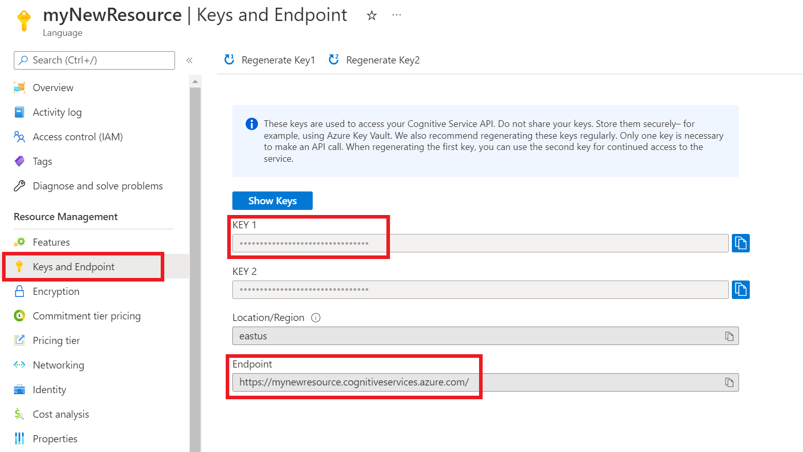 On the screen for your resource, select Keys and endpoint on the left pane. You will use one of your keys and your endpoint in the steps below.