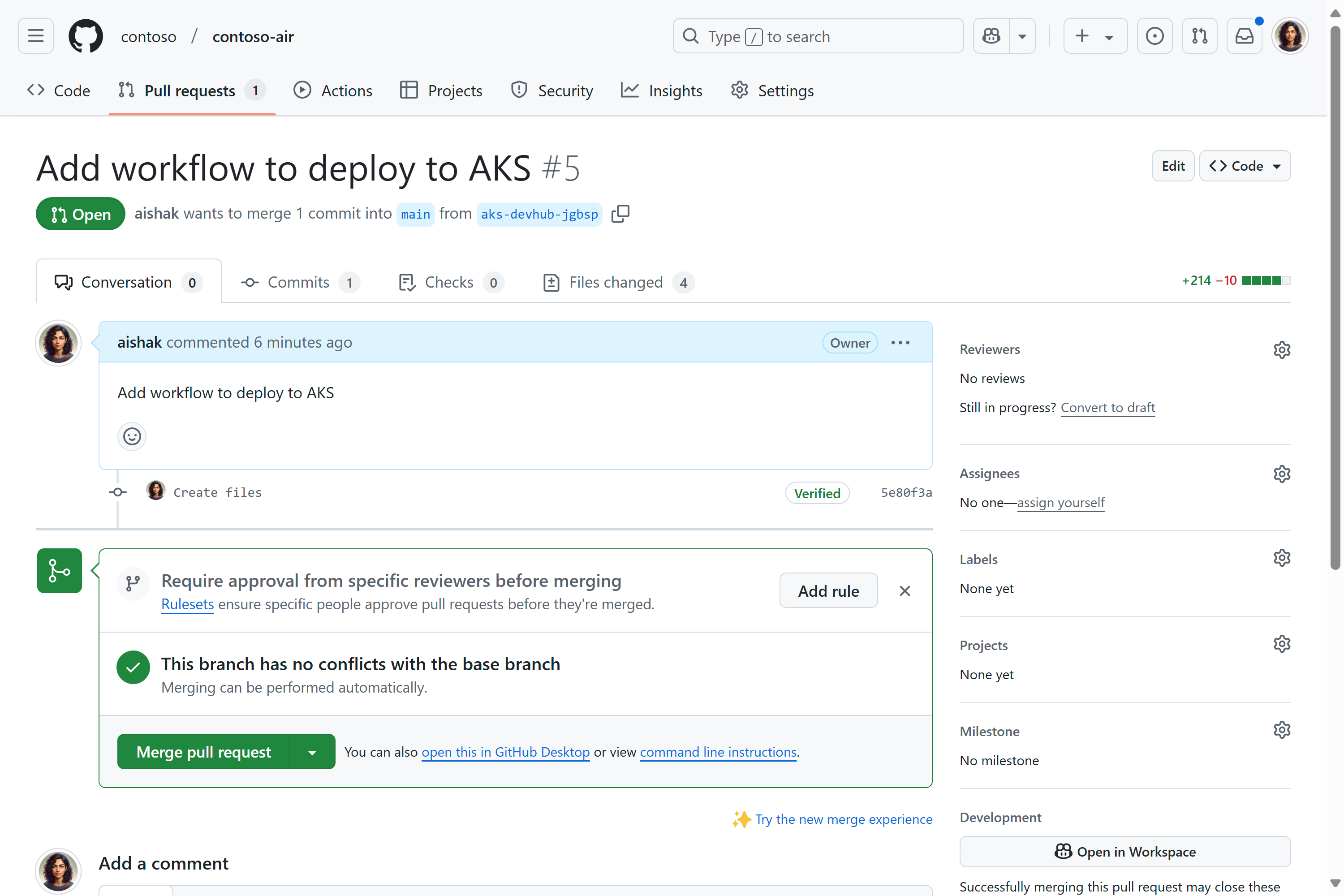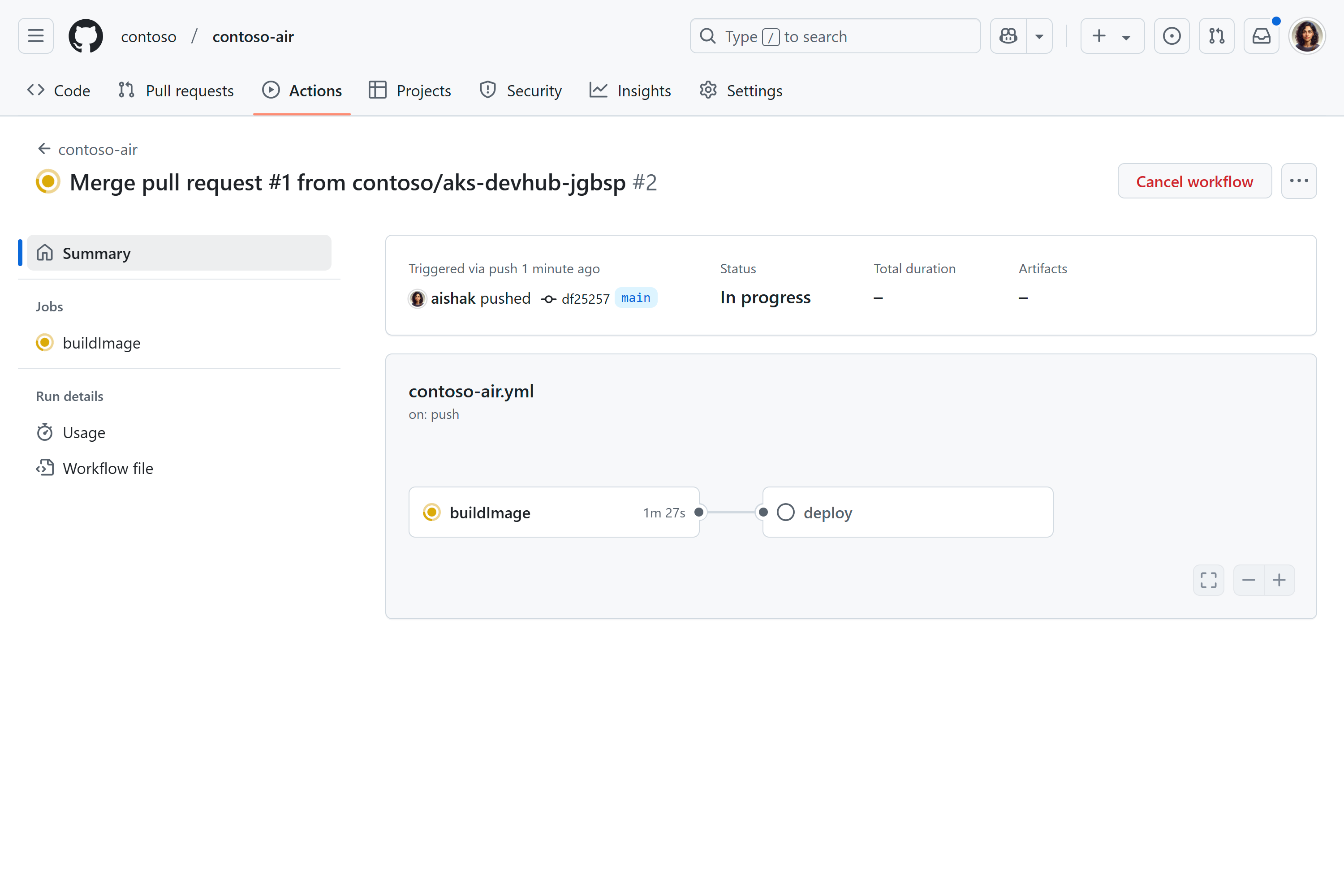 Merging the change runs the GitHub Actions workflow that builds your application into a container image, stores it in Azure Container Registry, and deploys it to the cluster.