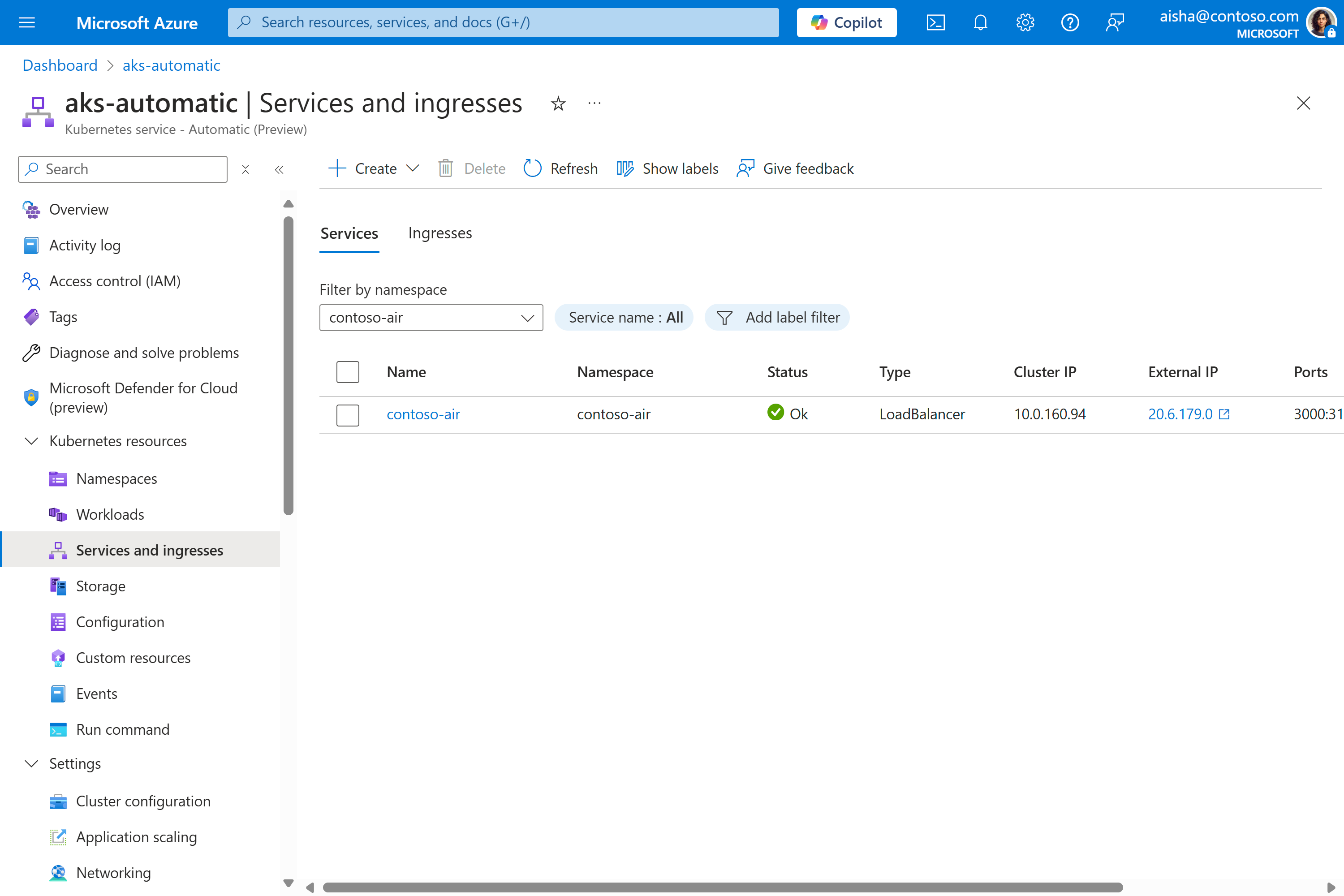 After the pipeline is completed, you can review the created Kubernetes Service in the Azure portal by selecting Services and ingresses under the Kubernetes resources section of the service menu.