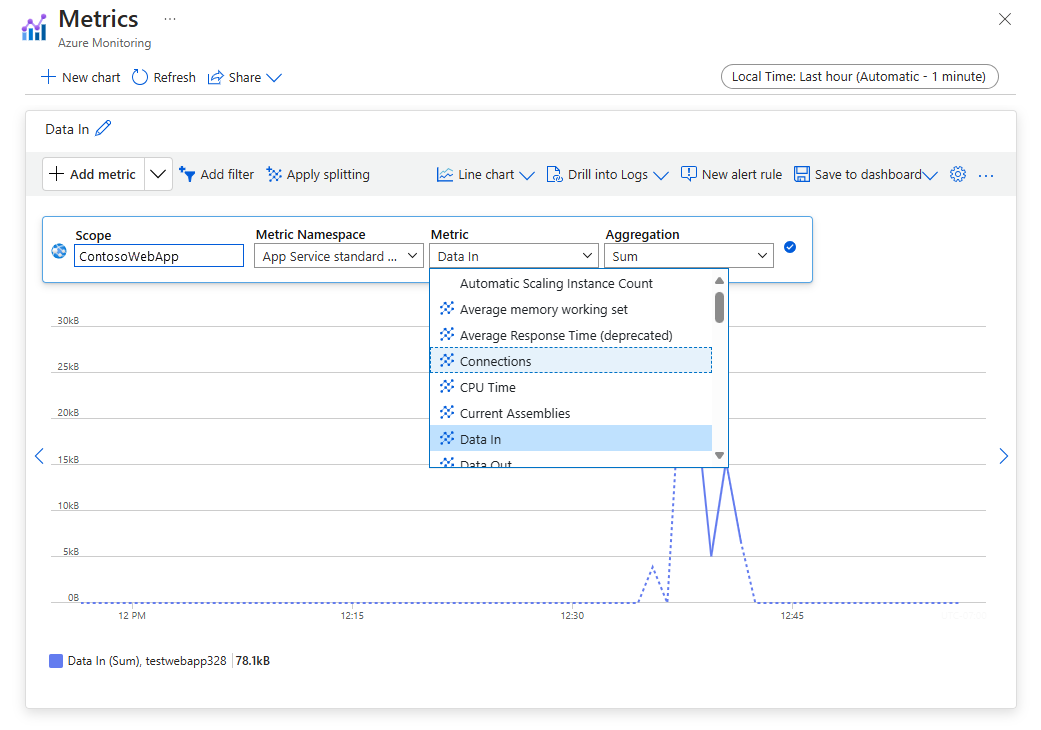 For a list of available metrics for apps or for App Service plans, see Supported metrics for Microsoft.Web.