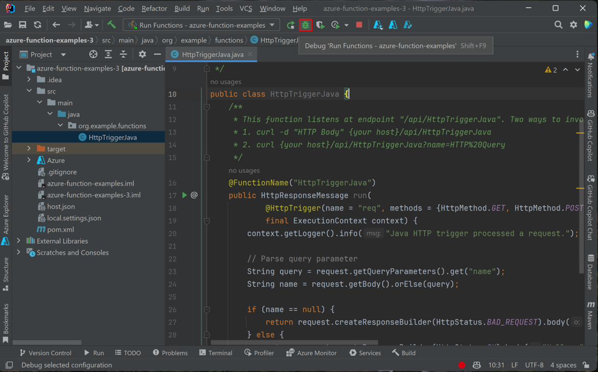 http://localhost:7071/api/HttpTriggerJava?name=Azure.The log is also displayed in your IDEA. Stop the function app by selecting Stop.