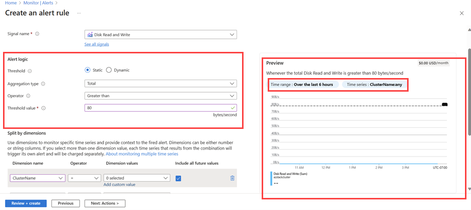 In the Alert logic section, add details like threshold, operator, aggregation type, threshold values, unit, threshold sensitivity, aggregation granularity, and frequency of evaluation and then select Next: Actions >.