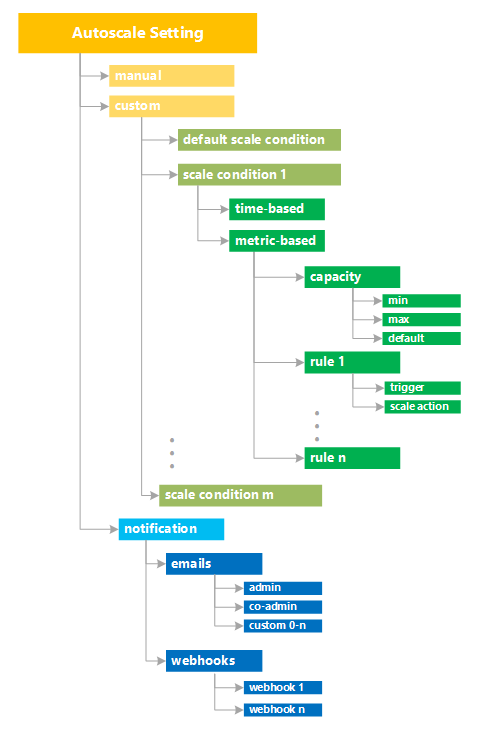 Autoscale settings includes scale conditions that define rules, limits, and schedules and notifications. Define one or more scale conditions in the settings and one notification setup.