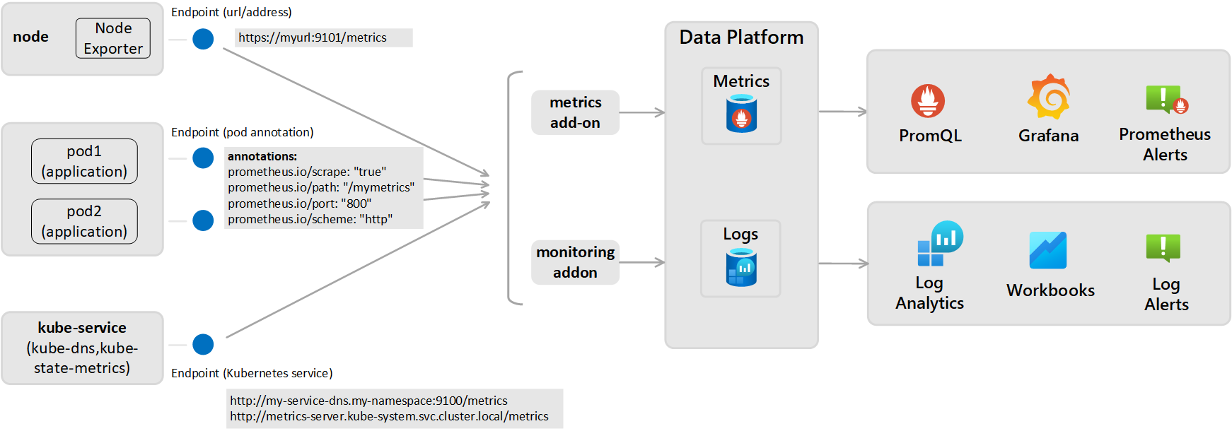 This configuration requires configuring the monitoring addon for the Azure Monitor agent, which is the same one used by Container insights to send data to a Log Analytics workspace. It requires exposing the Prometheus metrics endpoint through your exporters or pods and then configuring the monitoring addon for the Azure Monitor agent used by Container insights as shown the following diagram.