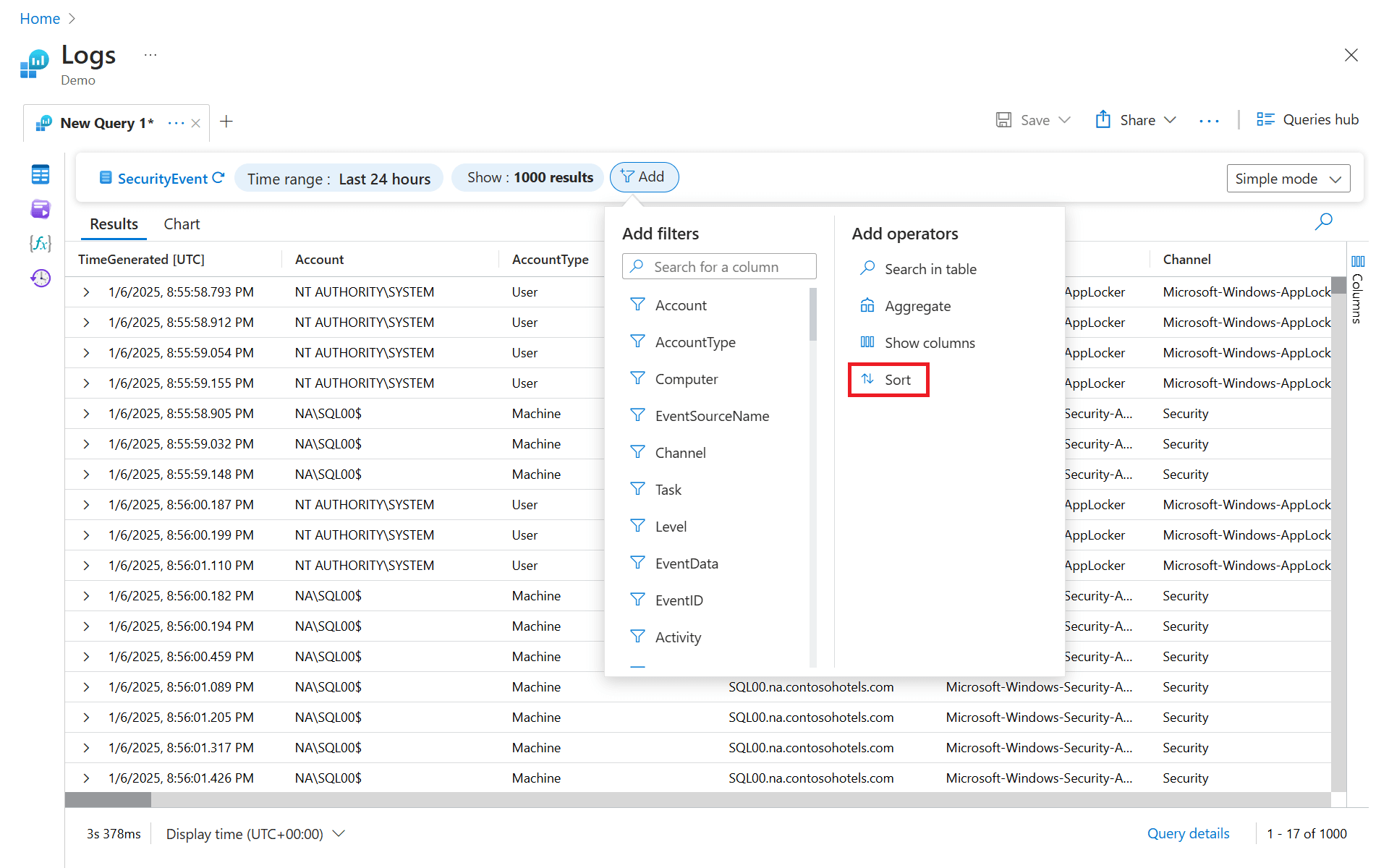 SecurityEvent | sort by TimeGenerated