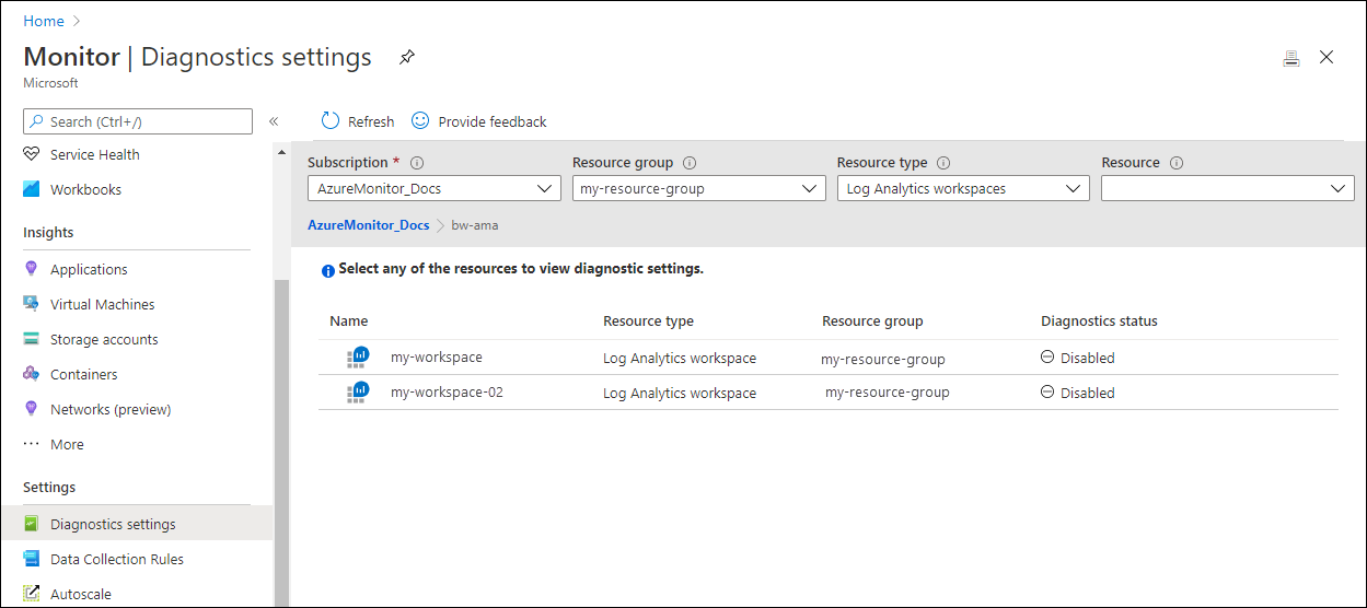 From the Azure Monitor menu, select Diagnostic settings, and then locate and select the workspace.