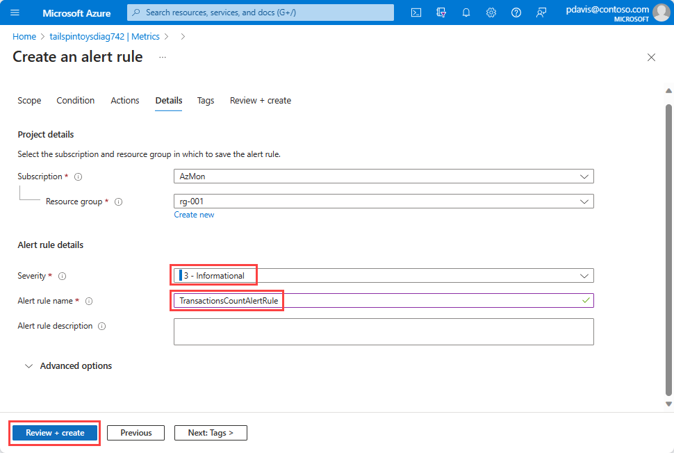 Select Review + create to review the alert rule.