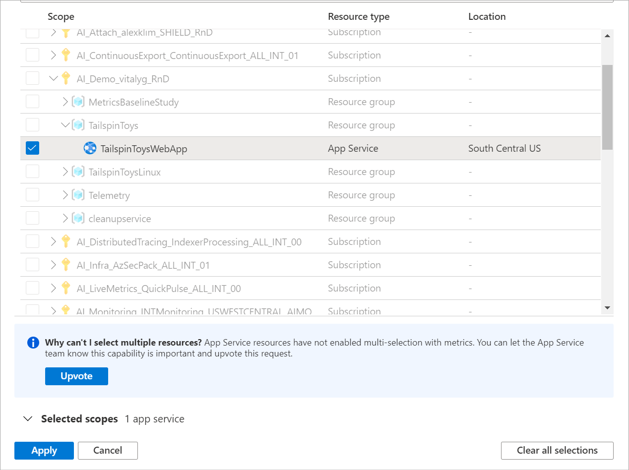 If you want the capability to view the metrics for multiple resources at the same time, or to view metrics across a subscription or resource group, select Upvote.