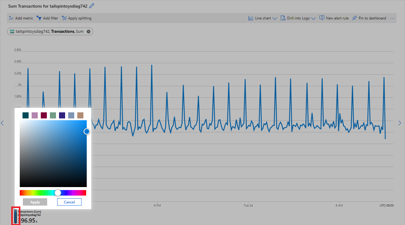The time picker lets you configure the time range for your metric chart to view data that's relevant to your monitoring scenario. By default, the chart shows the most recent 24 hours of metrics data.
