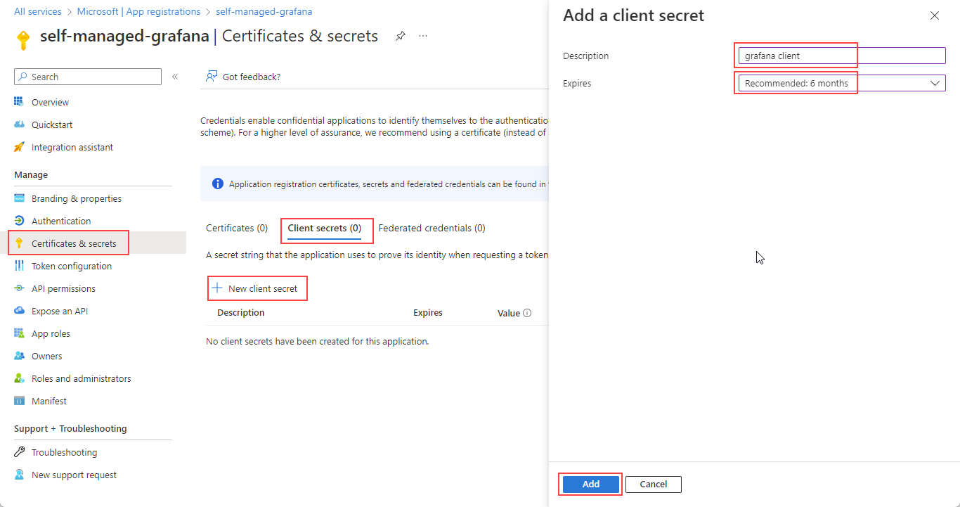 Create a process to renew the secret and update your Grafana data source settings before the secret expires. After the secret expires, Grafana loses the ability to query data from your Azure Monitor workspace.