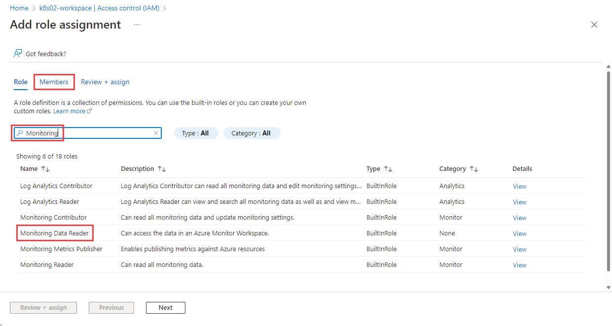 On the Add role assignment page, search for Monitoring.