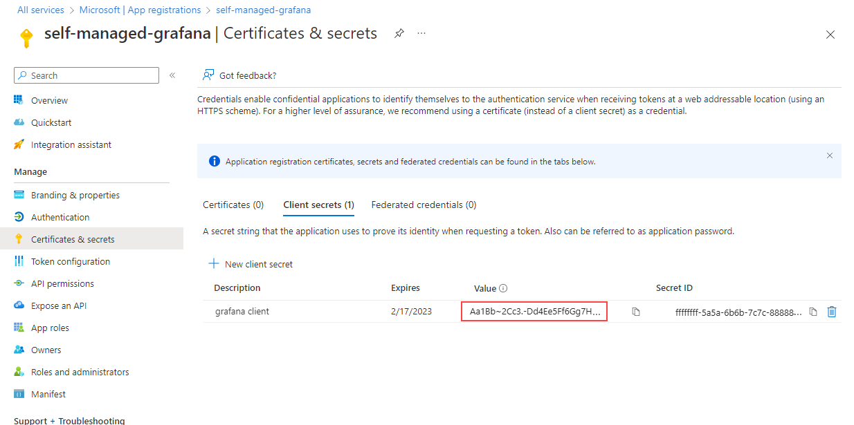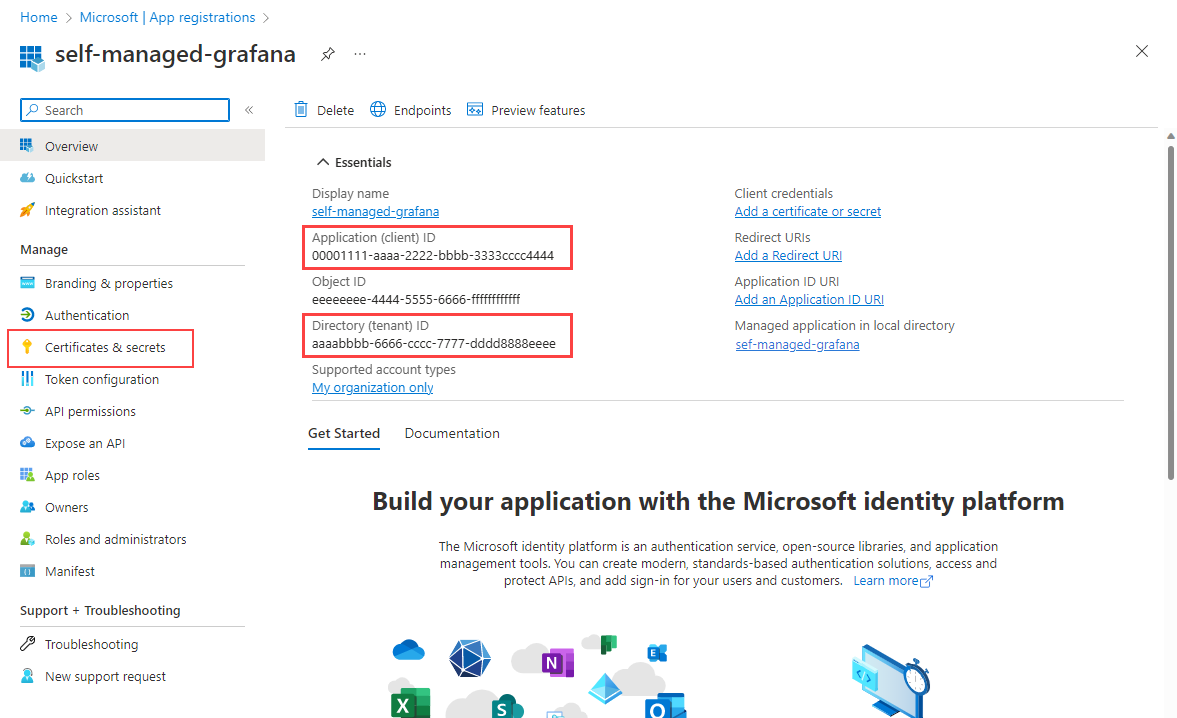 Note the Application (client) ID value and Directory (tenant) ID value. They're used in the Grafana authentication settings.