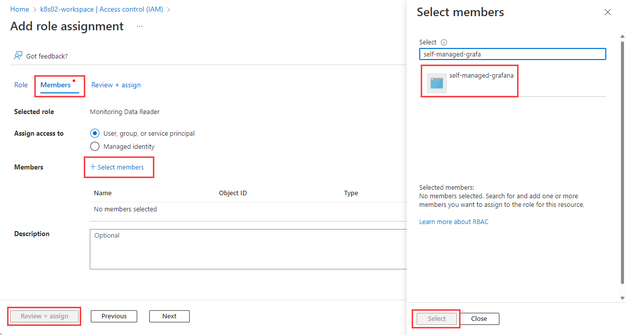 Choose Select members. Search for the app that you registered in the Register an app with Microsoft Entra ID section and select it.