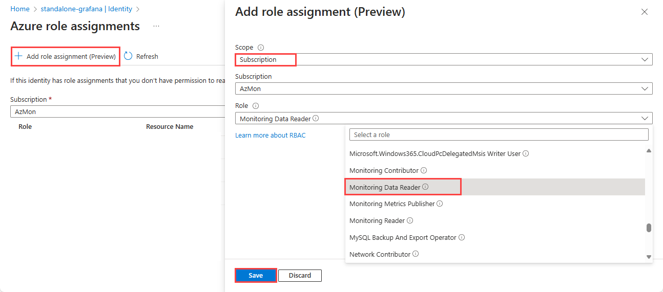 From the Role dropdown list, select Monitoring Data Reader and then select Save.