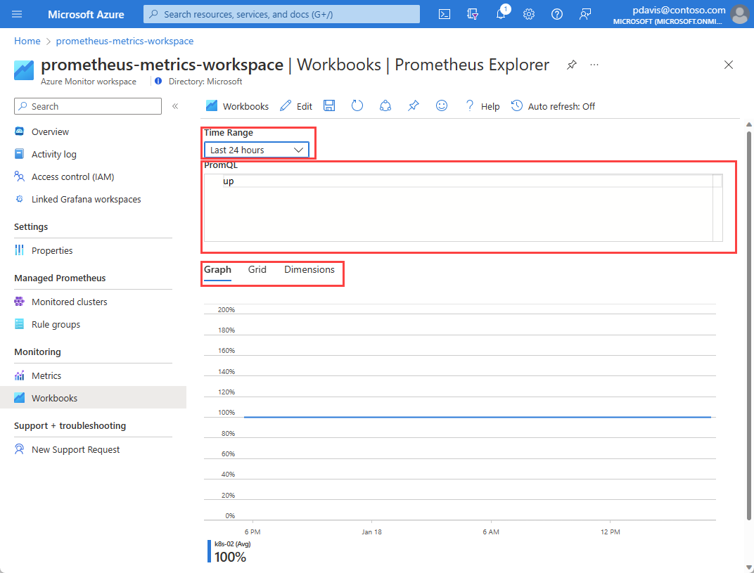 Azure Monitor workspaces include an exploration workbook to query your Prometheus metrics.