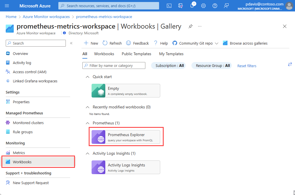 On the Workbooks menu item, and in the Azure Monitor workspace gallery, select the Prometheus Explorer workbook tile.