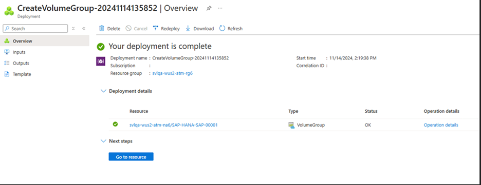 A notification confirms when the operation completes successfully. When you see this message, you can select Go to resource to view the newly created volume group.