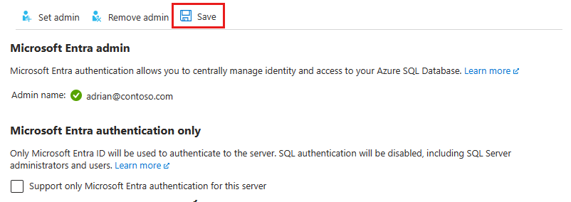 At the top of the Microsoft Entra ID page for your logical server, select Save.