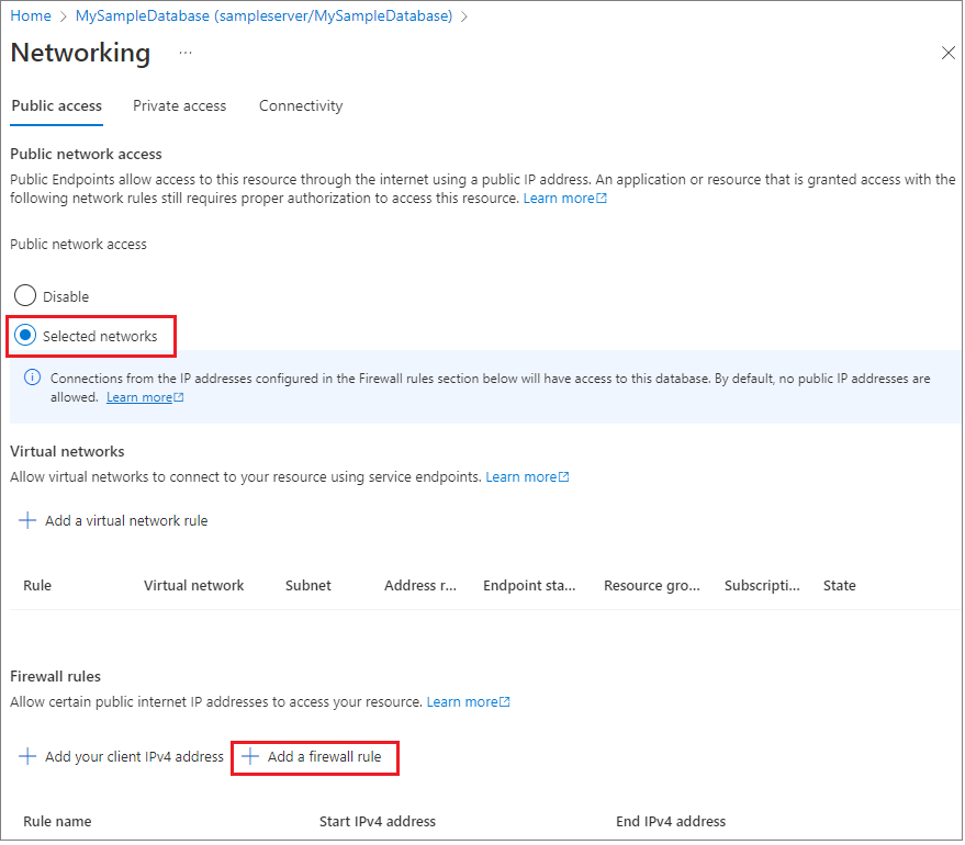 3. Set Public network access to Selected networks to reveal the virtual networks and firewall rules. When set to Disabled, virtual networks and firewall rule settings are hidden.