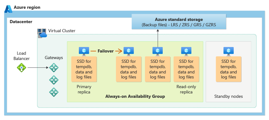 • A stateful data layer with the database files (.mdf and .ldf) stored in Azure Blob Storage. Azure Blob Storage has built-in data availability and redundancy features. Locally redundant availability is based on storing your data on locally redundant storage (LRS) which copies your data three times within a single datacenter in the primary region. It guarantees that every record in the log file or page in the data file will be preserved even if database engine process crashes.