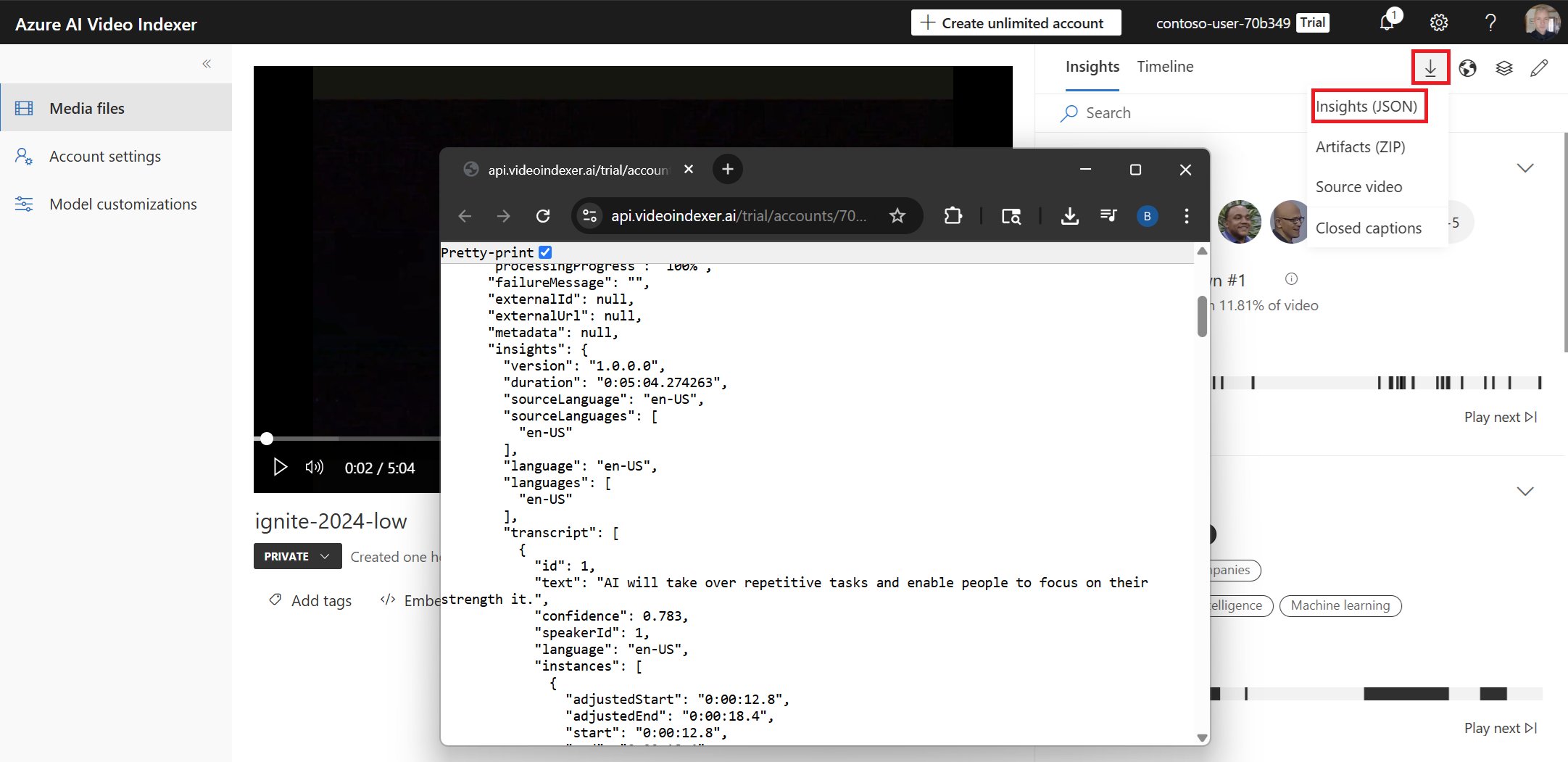 - When indexing finishes, select your video to see the insights.