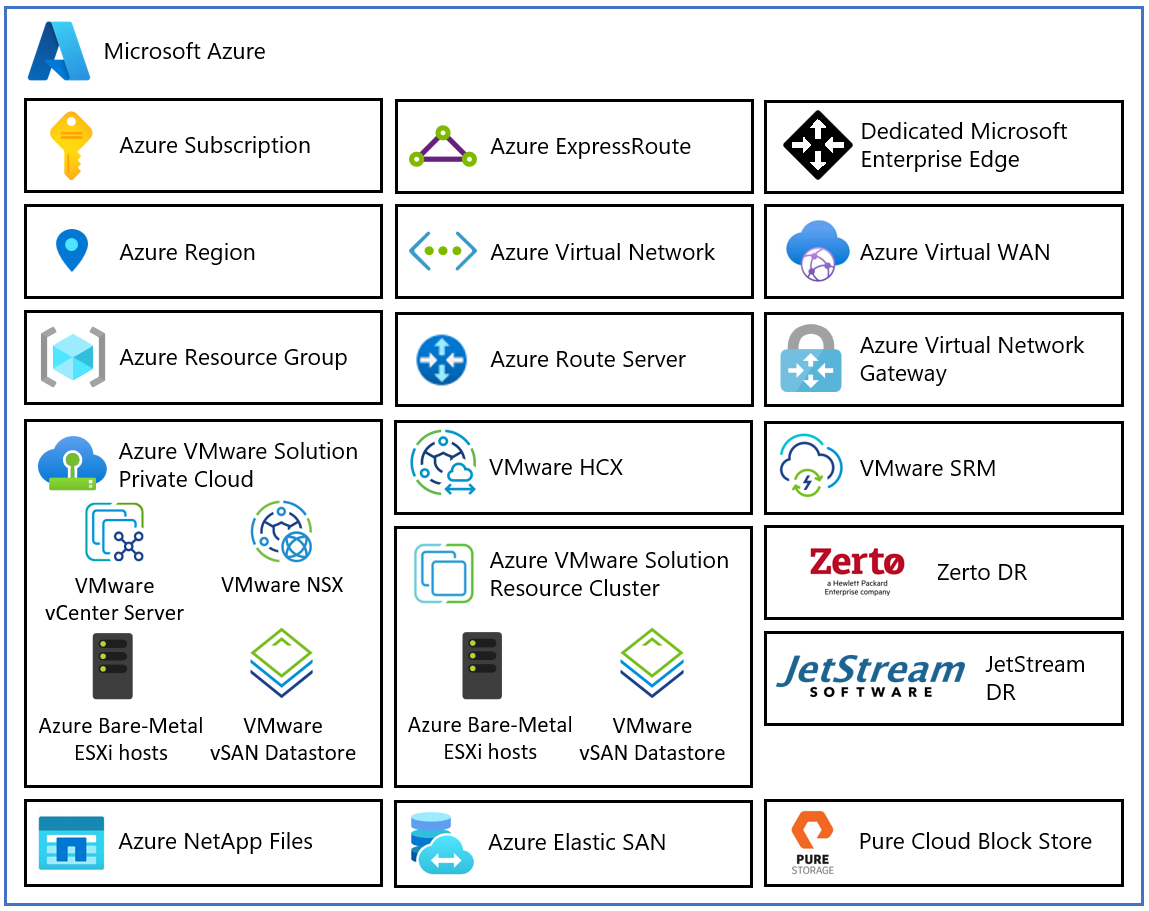 - Azure VMware Solution resource cluster: Provides compute, networking, and storage resources for customer workloads by scaling out the Azure VMware Solution private cloud by using VMware software, including vSAN software-defined storage and Azure bare-metal ESXi hosts. Azure NetApp Files, Elastic SAN, and Pure Cloud Block Store are also supported.