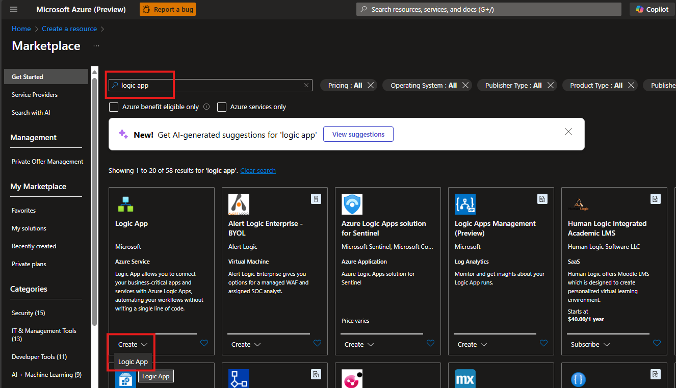- From your Azure portal, select Create a resource, then search for Logic App. Find the one called Logic App, select Create, then click Logic App.