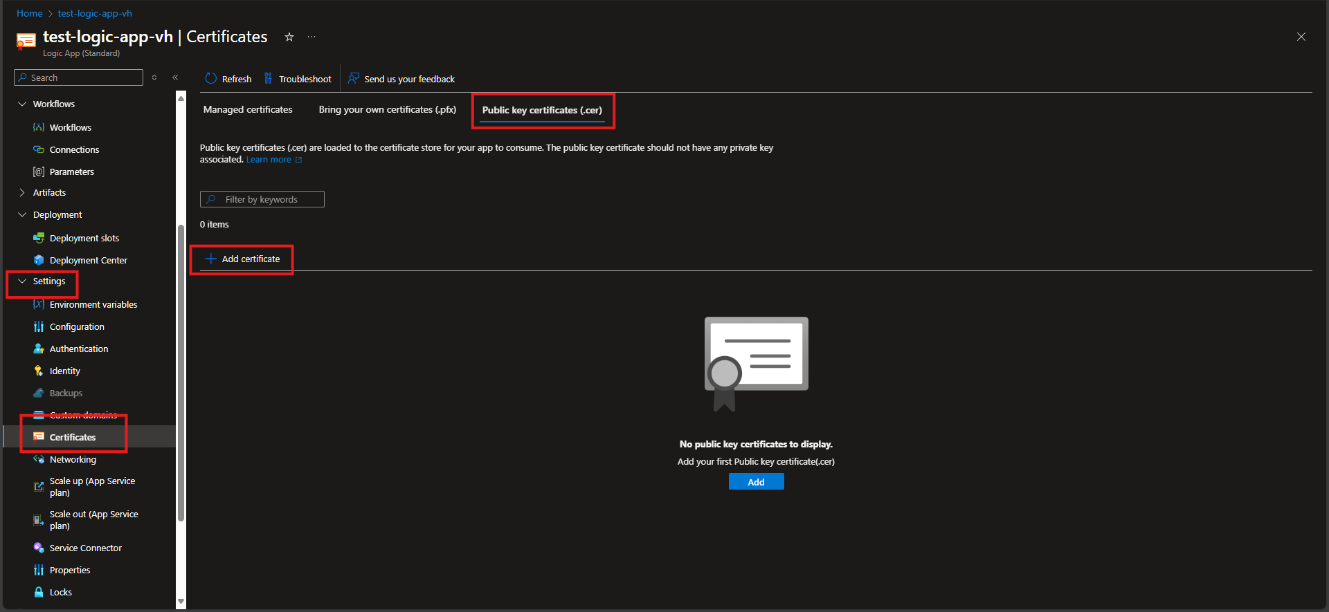 In the Azure Logic App, navigate to Settings > Certificates. Navigate to the tab that says Public key certificates (.cer) and click on Add certificate.
