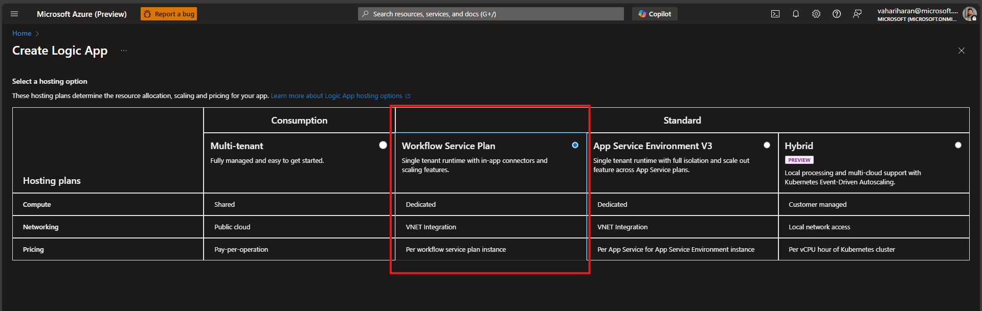 - Select the Hosting plan that makes the most sense for your consumption needs. In most cases, the Workflow Service Plan should suffice.