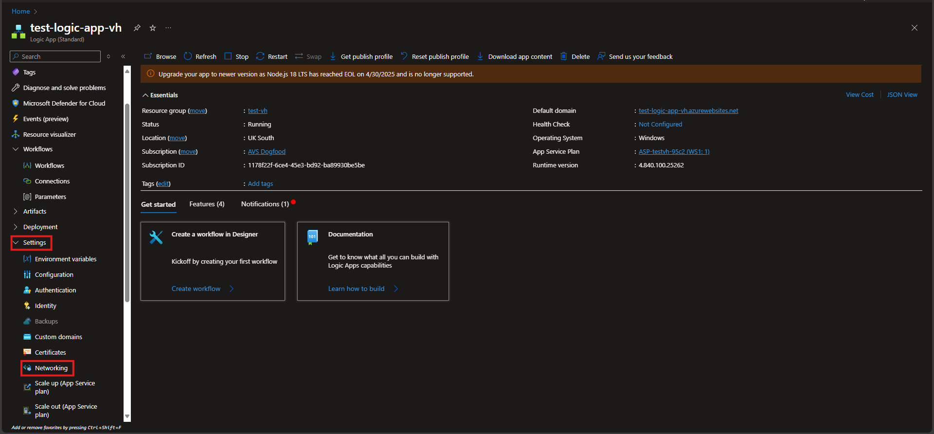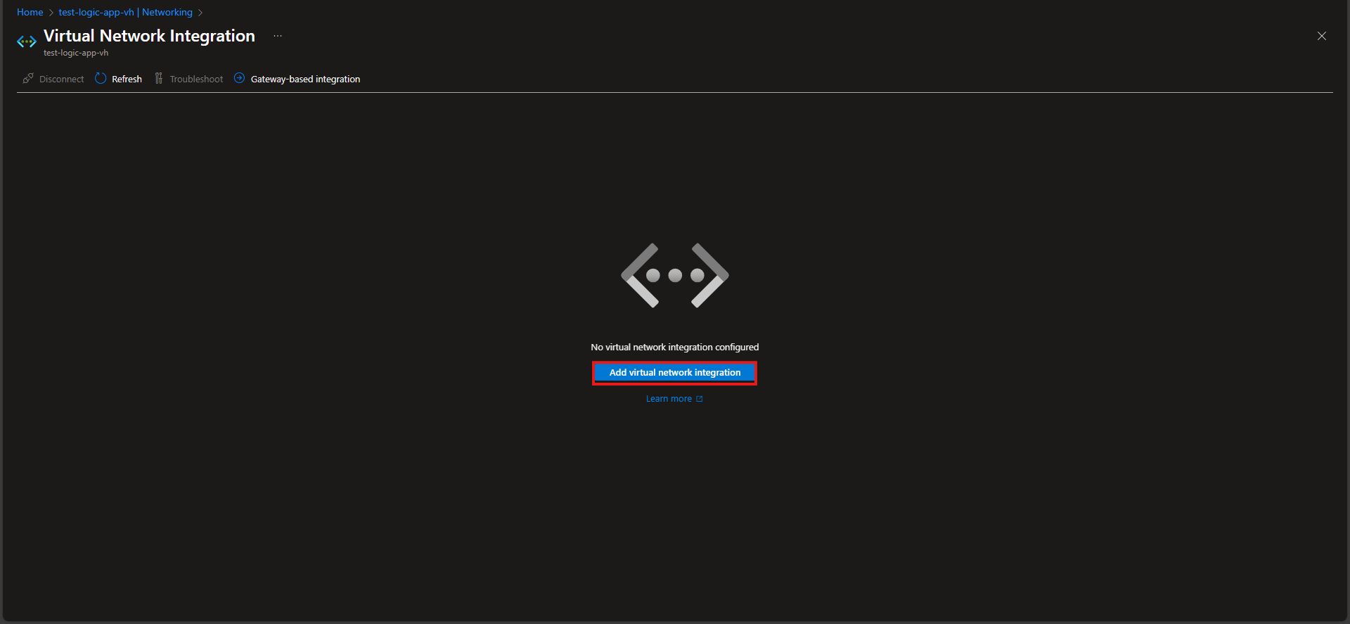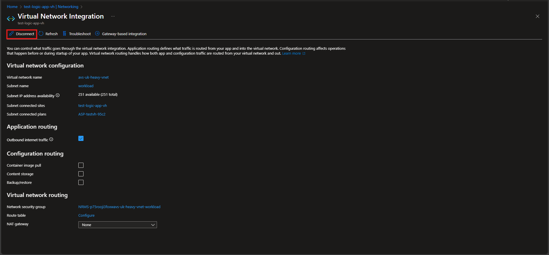 Upon successful integration, the next screen will display the Virtual Network Integration details. You can always click on Disconnect if you need to change the virtual network integration for your Logic App.