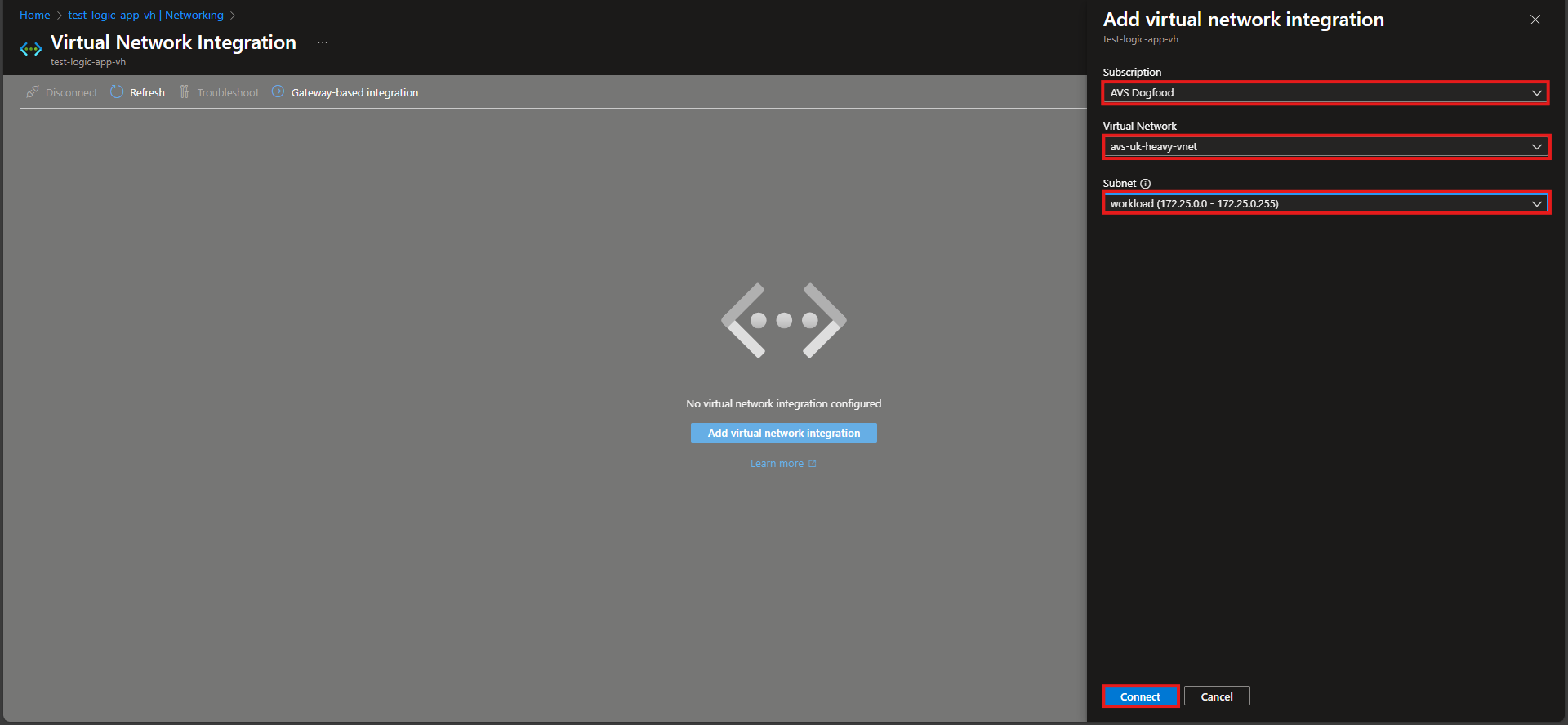 If your log management server is hosted in Azure - for example, your VMware Cloud Foundation Operations for Logs in your Azure VMware Solution private cloud - you will need to integrate your Azure Logic App with an Azure virtual network that can be reached by the log management server. This ensures the Logic App can communicate with endpoints that are only accessible within the virtual network.