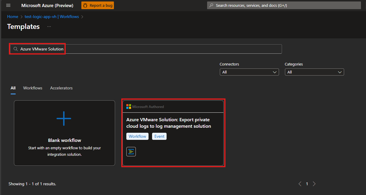 - In the search bar, search for Azure VMware Solution. Click on the option called Azure VMware Solution: Export private cloud logs to log management solution.