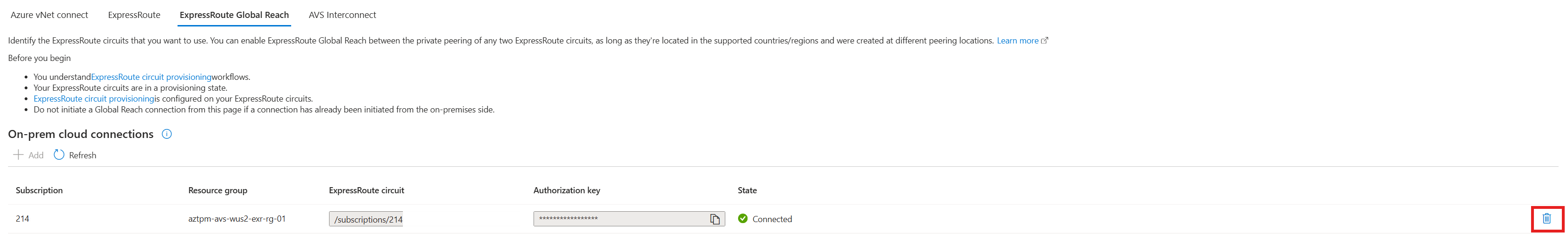 From the private cloud, under Manage, select Connectivity > ExpressRoute Global Reach > Add.