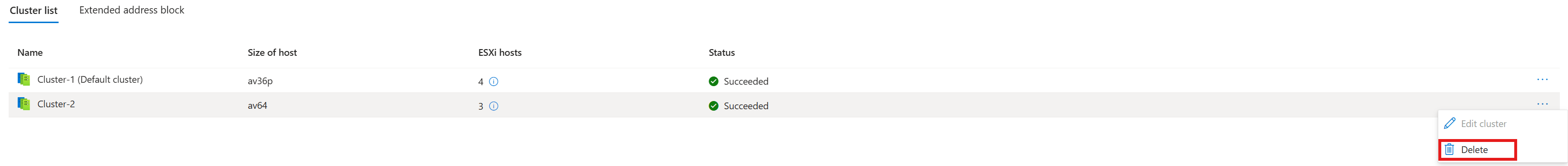 Screenshot showing how to delete a cluster to an Azure VMware Solution private cloud.