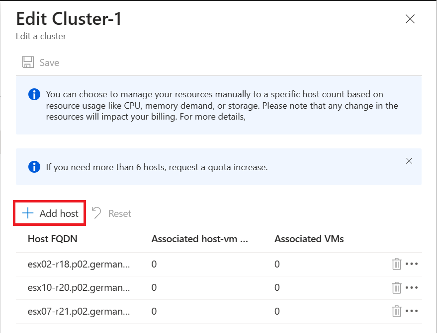 3. Select Add Host to add a host to the cluster. Repeat that to reach the desired number of hosts, and then select Save.