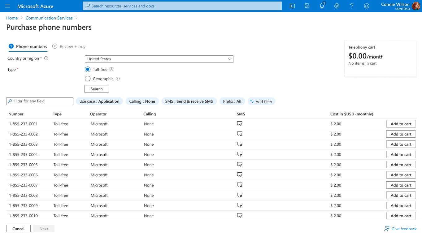 2. Once you find the phone number or numbers to your choosing, select Add to cart to hold the numbers in the Telephony cart. These numbers are held for 16 minutes before your cart is automatically cleared.