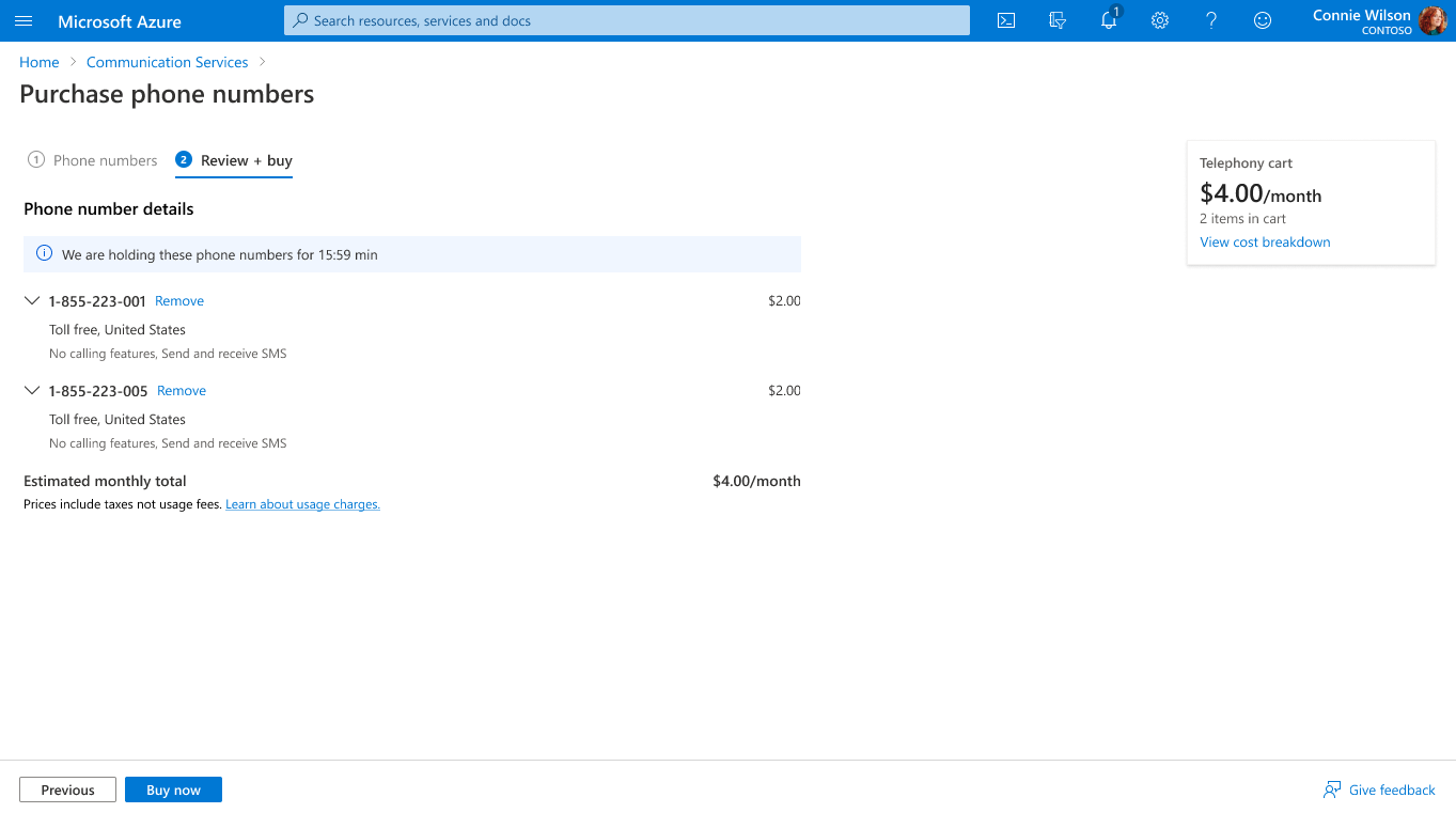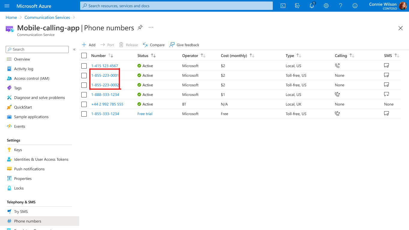 4. You can find your purchased numbers back on the Phone numbers page. It might take a few minutes for the numbers to be provisioned.