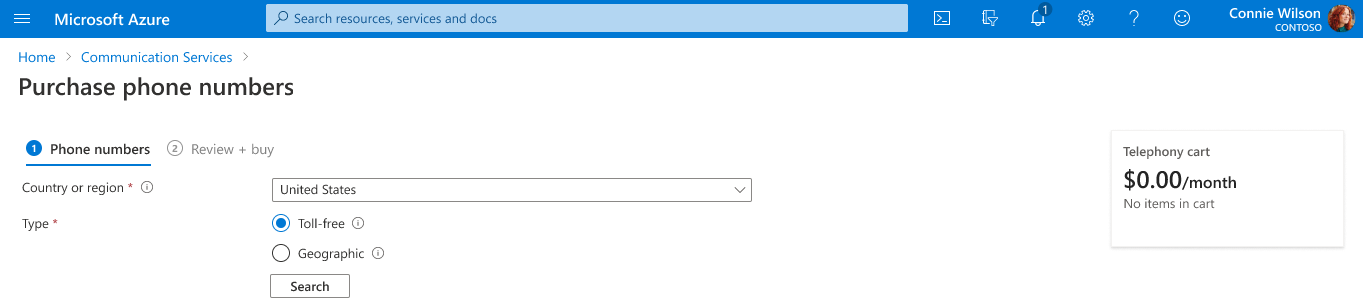 4. Choose the Country/region where you would like to provision the phone number. Country/region availability is based on the billing location for your Azure subscription. More information on what numbers are available for each country/region can be found here. Next you'll choose the number type. You can select from two phone number types: Local, and Toll-free.