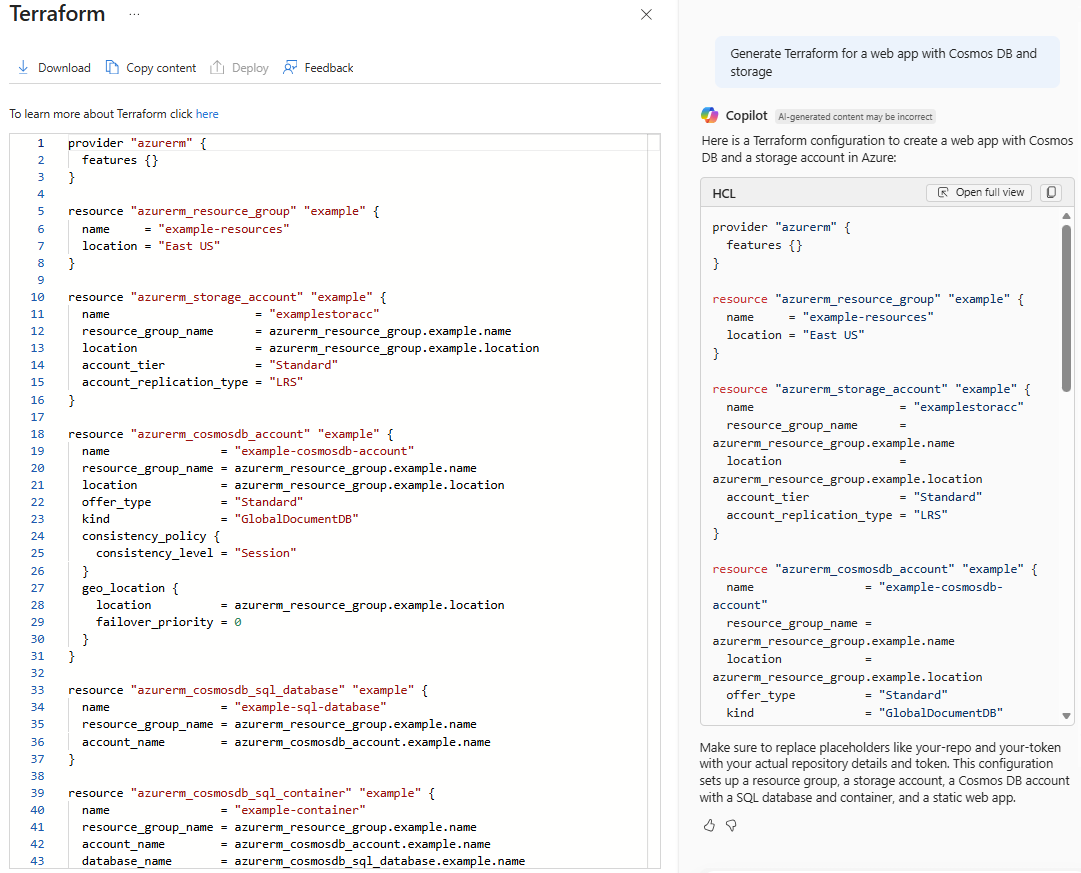 With either Terraform or Bicep, you can ask follow-up questions to further customize the results. When you're ready, copy or download the contents so you can deploy the configuration or template using your deployment method of choice. You can also use the Select full view option to see the entire configuration or template in a single view.