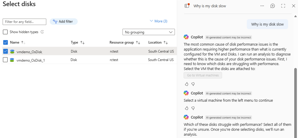 After you select a VM, you're prompted to select one or more disks for Azure Copilot to analyze.
