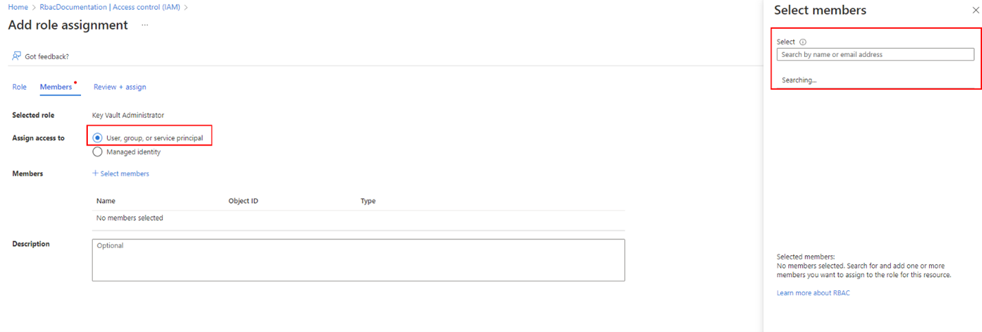 Search the Key Vault Administrator role and assign it to yourself. This assignment is done by first searching the role name from the list and then clicking on the Members tab. Once on the tab, select the User, group or service principal option from the radio and then look up your Azure account. Once the account is selected, the role can be assigned.