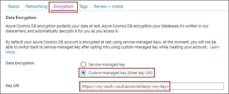When you create a new Azure Cosmos DB account from the Azure portal, choose Customer-managed key in the Encryption step. In the Key URI field, paste the URI/key identifier of the Azure Key Vault key that you copied from the previous step: