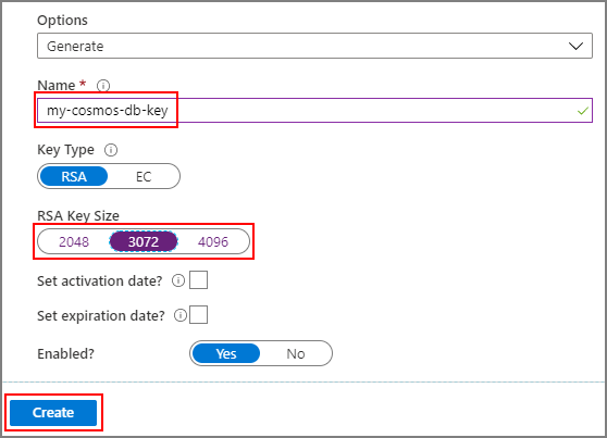 Select Generate/Import, provide a name for the new key, and select an RSA key size. A minimum of 3072 is recommended for best security. Then select Create: