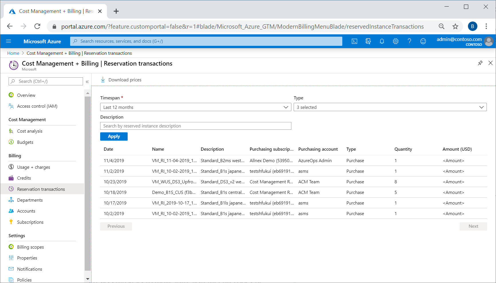 The Reservation transactions left menu item only appears if you have a billing scope selected. - To filter the results, select Timespan, Type, or Description.